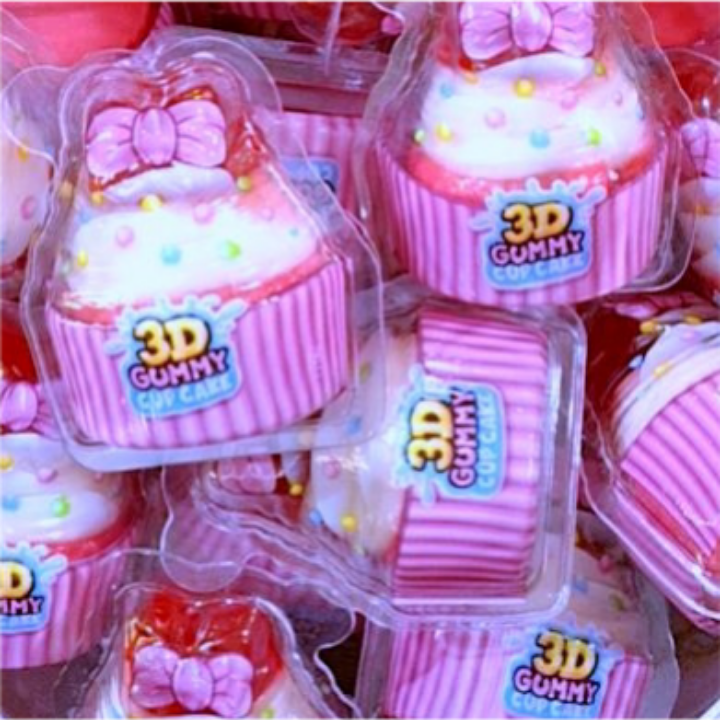 Piankowe żelki „Babeczka 3D” z płynnym nadzieniem w środku o intensywnym smaku owocowym. Każda żelka pakowana osobno w plastikowe pudełeczko. Masa netto 1 szt 18 g.