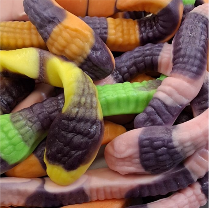 Składniki: syrop glukozowy, cukier, żelatyna spożywcza, koncentraty owocowe i warzywne, kwasy: kwas cytrynowy, kwas mlekowy, aromaty, barwniki: karmin, kurkumina, błękit brylantowy FCF, substancje glazurujące: wosk pszczeli biały i żółty, wosk carnauba.