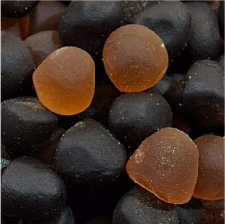Składniki: syrop glukozowy, cukier, żelatyna spożywcza, koncentraty owocowe i warzywne, kwasy: kwas cytrynowy, kwas mlekowy, aromaty, barwniki: karmin, kurkumina, błękit brylantowy FCF, substancje glazurujące: wosk pszczeli biały i żółty, wosk carnauba, naturalna kawa mielona