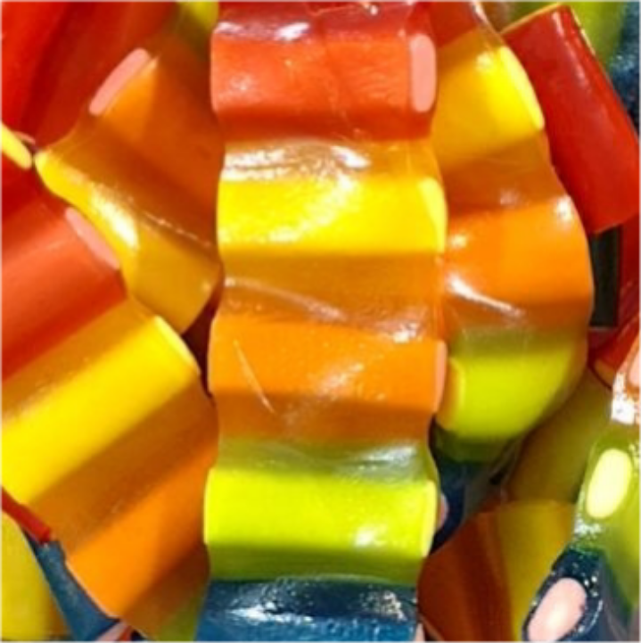 Składniki: syrop glukozowy, cukier, żelatyna spożywcza, koncentraty owocowe i warzywne, kwasy: kwas cytrynowy, kwas mlekowy, aromaty, barwniki: karmin, kurkumina, błękit brylantowy FCF, substancje glazurujące: wosk pszczeli biały i żółty, wosk carnauba.