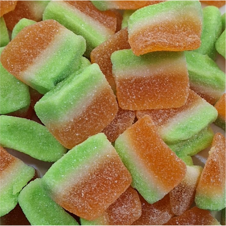 Składniki: syrop glukozowy, cukier, żelatyna spożywcza, koncentraty owocowe i warzywne, kwasy: kwas cytrynowy, kwas mlekowy, aromaty, barwniki: karmin, kurkumina, błękit brylantowy FCF, substancje glazurujące: wosk pszczeli biały i żółty, wosk carnauba.