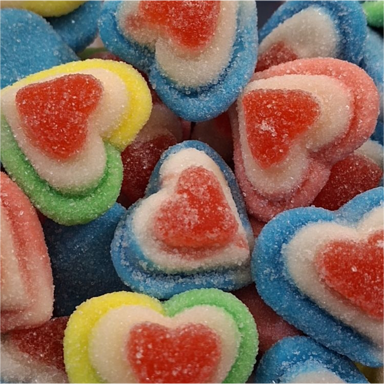 Składniki: syrop glukozowy, cukier, żelatyna spożywcza, koncentraty owocowe i warzywne, kwasy: kwas cytrynowy, kwas mlekowy, aromaty, barwniki: karmin, kurkumina, błękit brylantowy FCF, substancje glazurujące: wosk pszczeli biały i żółty, wosk carnauba.