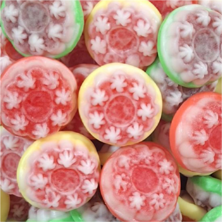 Składniki: syrop glukozowy, cukier, żelatyna spożywcza, koncentraty owocowe i warzywne, kwasy: kwas cytrynowy, kwas mlekowy, aromaty, barwniki: karmin, kurkumina, błękit brylantowy FCF, substancje glazurujące: wosk pszczeli biały i żółty, wosk carnauba.